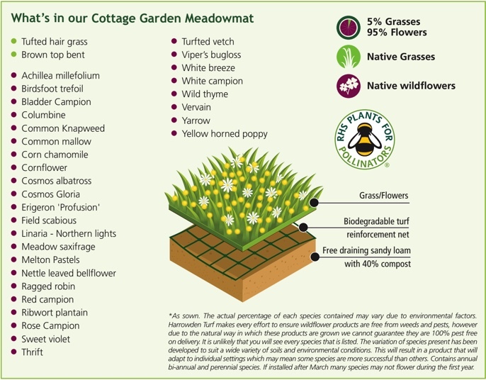 Harrowden Turf Heritage Meadowmat is a blend of 1 slow growing grass and 21 native wildflowers that have been selected for their ability to grow in shallow, poor nutrient soils. Most of the species are perennial which means they will flower every year if the conditions are suitable. The specially selected grass ensures an all year-round coverage. Harrowden Turf Heritage Meadowmat was originally designed as a quick-to-install green roofing material but is just as happy when installed on the ground. Harrowden Turf Heritage Meadowmat will contain mature plants, root fibre and enough soil to maintain the plants during establishment.